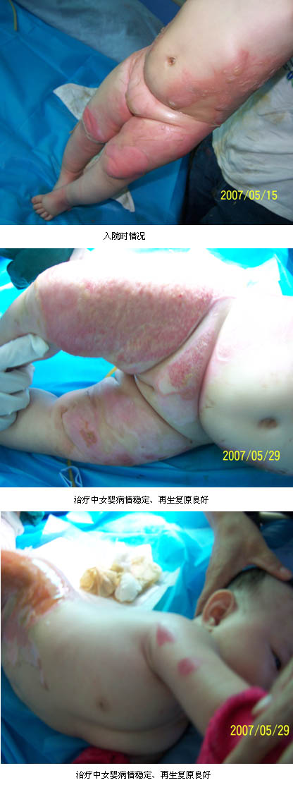 2007年5月16日,一個只有4個月大小的女嬰被家長急送到中山市黃圃人民醫(yī)院燒傷創(chuàng)瘍科,原來該患兒在半小時前被剛燒滾的熱水燙傷了,入院時檢查,患兒精神萎靡不振,哭聲低,表情淡漠。反應(yīng)差。入院診斷:燒傷休克,大面積特重度熱水燙傷40%TBSA(淺II度5%TBSA,深I(lǐng)I度淺型15%TBSA,深I(lǐng)I度深型10%TBSA,III度淺型5%TBSA,III度深型5%TBSA)。入院后,經(jīng)過積極的抗休克、抗感染等綜合治療,同時規(guī)范應(yīng)用皮膚原位再生技術(shù)進行創(chuàng)面處理,盡管患兒一度出現(xiàn)SIRS表現(xiàn),但由于規(guī)范應(yīng)用皮膚原位再生醫(yī)療技術(shù),患兒平穩(wěn)度過了休克期和創(chuàng)面液化期和高代謝期,經(jīng)過35天的治療患兒創(chuàng)面全部自行愈合。