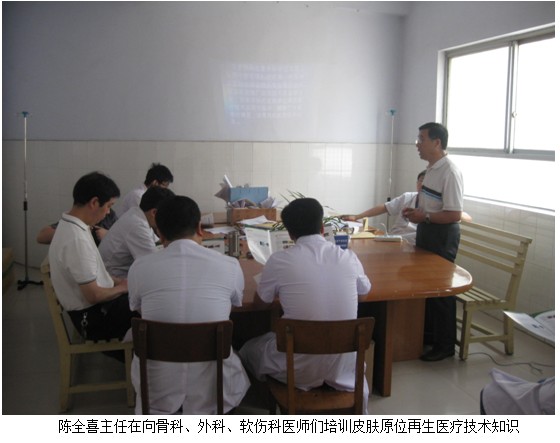 2012年6月2號(hào)上午,中國(guó)中西醫(yī)結(jié)合學(xué)會(huì)燒傷專業(yè)委員會(huì)委員、北京美寶燒傷創(chuàng)瘍研究所臨床部技術(shù)推廣專家陳全喜主任應(yīng)邀來(lái)到洛陽(yáng)市孟津縣人民醫(yī)院骨科、外科、軟傷科,進(jìn)行了科室的皮膚原位再生醫(yī)療技術(shù)培訓(xùn)。