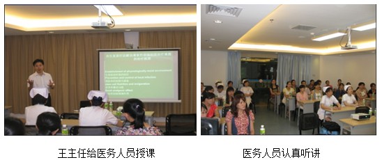 2011年10月17日,中國(guó)中西醫(yī)結(jié)合學(xué)會(huì)燒傷專業(yè)委員會(huì)常委兼秘書、《中國(guó)燒傷創(chuàng)瘍雜志》副總編輯、北京美寶燒傷創(chuàng)瘍研究所副所長(zhǎng)、第二臨床研究部主任王洪生研究員應(yīng)邀到該院神經(jīng)外科做“再生復(fù)原療法對(duì)難愈性創(chuàng)面的治療新進(jìn)展”臨床專題學(xué)術(shù)講座,該科三個(gè)病區(qū)的護(hù)士長(zhǎng)及全體護(hù)理人員參加了學(xué)術(shù)講座,在學(xué)術(shù)講座中,王主任對(duì)各種難愈性創(chuàng)傷、潰瘍創(chuàng)面的規(guī)范處理方法與技巧利用多媒體教學(xué)方式,結(jié)合大量的圖片及錄像資料進(jìn)行了詳細(xì)講解。