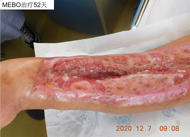 患者右上肢被機(jī)器絞傷10天、加重5天后,于10月16 日,來到北京南苑醫(yī)院燒傷創(chuàng)瘍科,當(dāng)時右上肢廣泛皮膚軟組織絞挫撕脫傷并感染、右側(cè)橈骨中遠(yuǎn)段多發(fā)開放性骨折、右尺骨莖突骨折。北京南苑醫(yī)院燒傷創(chuàng)瘍科采用了燒傷創(chuàng)瘍再生醫(yī)療技術(shù),在原位培養(yǎng)皮膚組織器官再生,并配合微粒皮移植術(shù)以加速創(chuàng)面愈合。這位在外院多家大醫(yī)院均被告知需要截肢的病人在南苑醫(yī)院不僅成功保住了肢體,還恢復(fù)了部分功能并在進(jìn)一步康復(fù)中,已于12月10出院。