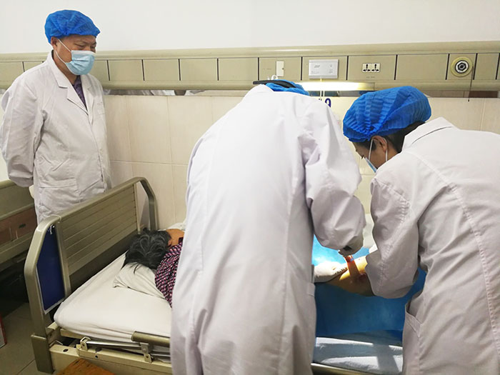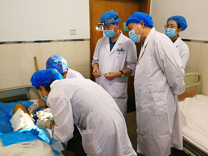 楊智斌總裁此行還會見了西安交通大學附屬西安第九醫(yī)院燒傷科肖厚安主任,該院作為陜西中西醫(yī)結(jié)合學會燒傷專業(yè)委員會主委單位,在再生醫(yī)療技術(shù)的臨床應用中取得了一定成果,特別是在再生療法配合自體微粒皮種植技術(shù)治療面積較大的皮瓣、組織缺損創(chuàng)面的應用方面,解決了傳統(tǒng)燒傷、創(chuàng)面治療缺少皮源這一難題。在肖厚安主任的陪同下,楊智斌總裁還現(xiàn)場觀摩了微粒皮種植術(shù)臨床應用,認真聽取了該科室多年來應用再生醫(yī)療技術(shù)治療的病例總結(jié)。