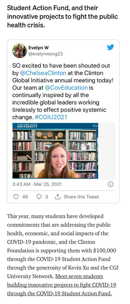 • 切爾西·克林頓著重介紹了CGI U “ 新冠病毒學生行動基金”的成員及其抗擊公共衛(wèi)生危機的創(chuàng)新項目。2021年,許多學生已作出承諾,應對COVID-19大流行對公共衛(wèi)生、經(jīng)濟和社會的影響,克林頓基金會通過Kevin Xu(徐鵬)和CGI U大學網(wǎng)絡的慷慨捐助,通過COVID-19學生行動基金向他們提供了10萬美元支持。