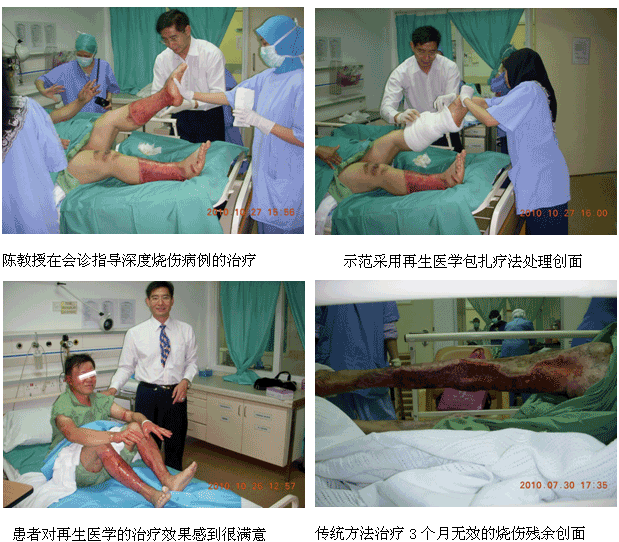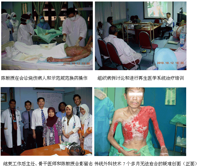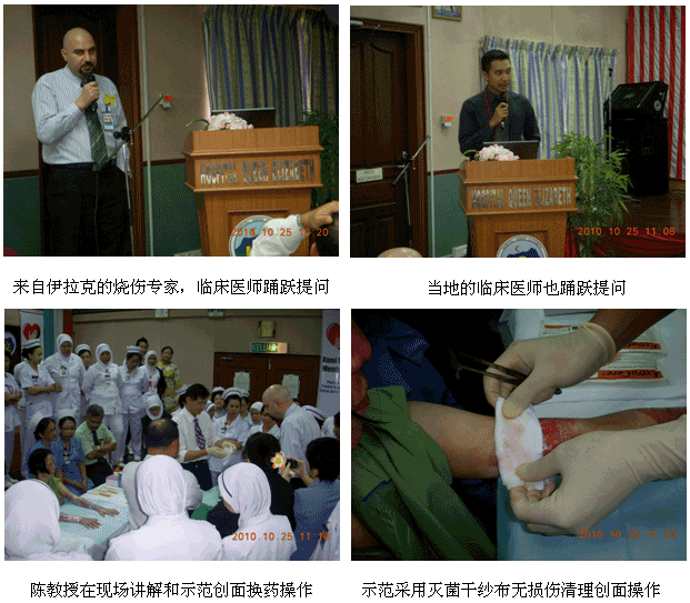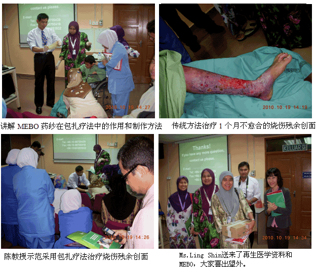 1、2010年10月11日上午7時30分,來自中國燒傷創(chuàng)瘍科技中心的陳永翀主任和負(fù)責(zé)馬來西亞學(xué)術(shù)推廣和醫(yī)療開發(fā)的Ms. Ling Shin Chew,應(yīng)馬來大學(xué)醫(yī)(UMMC)燒傷科負(fù)責(zé)人Dr. Margaret的邀請,來到了該院的外科病房會診和指導(dǎo)了3例疑難燒傷創(chuàng)瘍患者的治療,實現(xiàn)了很好的維護(hù)、提高再生醫(yī)學(xué)技術(shù)水平的效果。