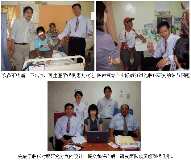 5、 10月15日,陳教授和Ms. Ling Shin再次應(yīng)Sultanah General Hospital (新山州中央醫(yī)院,當(dāng)?shù)刈畲蟮尼t(yī)院)醫(yī)院創(chuàng)傷骨科主任Dr. Thevarajan的邀請,到醫(yī)院進(jìn)行臨床指導(dǎo)和討論制定斷指再生的臨床研究方案.這是非常忙碌的一天,早上8時,陳教授剛到骨科的門診已有多位患者在等候,其中手指離斷損傷的有6例,創(chuàng)傷病例3例,陳教授均一一細(xì)心地查看和指導(dǎo),糾正治療過程中存在的一些不足和不夠規(guī)范的地方;處理完門診的患者后,陳教授在Dr.Yong的邀請下,來到病房為1例開放性骨折嚴(yán)重創(chuàng)傷軟組織缺損的小兒患者進(jìn)行了會診和指導(dǎo),患兒和家長對再生醫(yī)學(xué)治療的效果感到很滿意;處理完患者的治療后,陳教授、Dr. Thevarajan主任、Dr.Yong Aik Peng 和Ms.Ling Shin等共同討論了“A Large Sample Randomized Open-labeled Clinical Comparative Study on the Efficacy and Safety of Topically Applied Moist ExposedBurn Ointment (MEBO) and Opsite in Subjects with Finger Injuries”(MEBO與Opsite治療手指創(chuàng)傷的有效性與安全性的大樣本隨機(jī)臨床對照研究)的臨床研究課題,討論解決了方案中的一些具體問題,然后通過網(wǎng)絡(luò)在線報給了馬來西亞國家醫(yī)學(xué)臨床研究中心,獲準(zhǔn)立項,成為國家級的臨床研究項目,并開始實施。