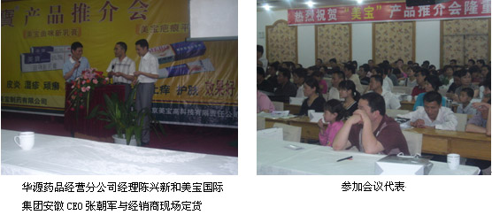 2006年5月27日下午2時30分,承接本次會議的太和鏡湖賓館的大廳內(nèi)擠滿了前來簽到報名的與會代表。參加本次培訓(xùn)推介會的有來自安徽華源醫(yī)藥股份有限公司和美寶國際集團(tuán)的各級領(lǐng)導(dǎo)、安徽華源醫(yī)藥股份有限公司的二級分銷商和部分第三終端客戶,近200人參加了本次推介會。3時推介會正式開始,會議由安徽華源醫(yī)藥股份有限公司藥品經(jīng)營部經(jīng)理王沖主持,首先安徽華源醫(yī)藥股份有限公司黨委副書記、紀(jì)檢書記、行政總監(jiān)、副總經(jīng)理總經(jīng)理張文濤致歡迎詞并預(yù)祝本次會議圓滿成功,隨后其藥品經(jīng)營分公司經(jīng)理陳興新向與會代表介紹了公司近幾年來的發(fā)展以及北京華源項(xiàng)目進(jìn)展情況,北京美寶燒傷研究所方進(jìn)勇主任用幻燈向大家介紹了美寶國際集團(tuán)在生命科學(xué)領(lǐng)域的最新進(jìn)展以及美寶高科技系列產(chǎn)品,美寶國際集團(tuán)常務(wù)董事、原燒傷創(chuàng)瘍再生醫(yī)學(xué)經(jīng)濟(jì)板塊總裁陳寶琪生動幽默的發(fā)言將會議推向高潮,他介紹了他本人及美寶多年來同太和的感情、美寶在再生醫(yī)學(xué)的霸主地位、產(chǎn)品在多學(xué)科、多領(lǐng)域的應(yīng)用等,最后陳總用“信任、效益、價值、發(fā)展”八個字總結(jié)了美寶國際集團(tuán)和安徽華源醫(yī)藥股份有限公司的合作。