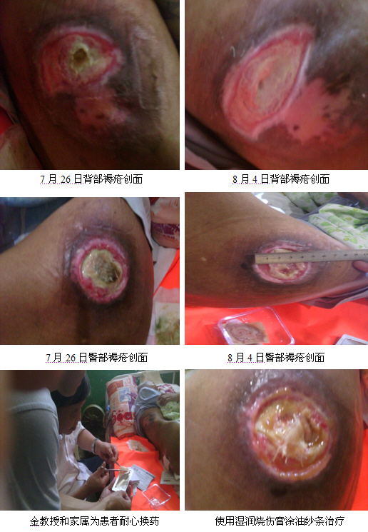 2010年8月4日,北京美寶燒傷創(chuàng)瘍研究所金黨軍教授接到湖北宜昌枝江的一位褥瘡患者需要會(huì)診的消息,立即從宜昌城區(qū)趕往枝江,到達(dá)患者家后,金教授即刻投入會(huì)診。該患屬于高齡患者,長(zhǎng)期臥床,生活不能自理,進(jìn)食需流質(zhì),有糖尿病史,目前血糖穩(wěn)定。該患背部,骶尾骨處和臀部均有褥瘡創(chuàng)面,深淺不一。背部褥瘡面達(dá)七厘米長(zhǎng),臀部達(dá)五厘米長(zhǎng),并有腔道。該患之前在宜昌市中心人民醫(yī)院住院一個(gè)多月,用過(guò)美皮康等泡沫敷料護(hù)理創(chuàng)面,但效果不太理想,在家屬購(gòu)買(mǎi)美寶創(chuàng)瘍貼后,使用一個(gè)多星期,創(chuàng)面已有好轉(zhuǎn)的現(xiàn)象。金教授小心輕柔地為該患去除創(chuàng)面的壞死組織,并涂濕潤(rùn)燒傷膏,制作濕潤(rùn)燒傷膏油紗條引流到空腔,最后覆蓋創(chuàng)瘍貼。金教授邊操作邊耐心地向患者家屬講解了護(hù)理要點(diǎn)、注意事項(xiàng)和換藥時(shí)間。金教授耐心、細(xì)致的講解得到了患者及家屬的好評(píng)。