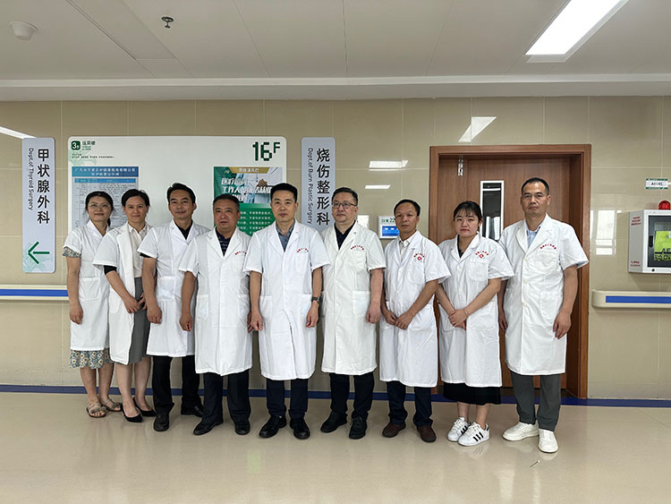 6月29日,東源縣中醫(yī)院吳院長(zhǎng)、葉副院長(zhǎng)和燒傷創(chuàng)瘍外科黃主任及護(hù)士等一行五人到華南理工大學(xué)附屬第六醫(yī)院燒傷整形科參觀交流,燒傷整形科李民主任和謝間英護(hù)士長(zhǎng)在科室會(huì)議室熱情接待了各位專家,吳院長(zhǎng)首先介紹了東源中醫(yī)院的發(fā)展歷史及醫(yī)院發(fā)展特色,希望能將燒傷創(chuàng)瘍專業(yè)作為醫(yī)院今后發(fā)展的一個(gè)特色???。接著李主任介紹了燒傷整形科的歷史及發(fā)展現(xiàn)狀,科室在搬入新院址后發(fā)展更加迅速,今年新成立了創(chuàng)面治療中心,李主任認(rèn)為創(chuàng)面治療是科室今后發(fā)展?jié)摿Ρ容^大的一塊業(yè)務(wù)。交流后李主任和護(hù)士長(zhǎng)帶領(lǐng)客人們參觀了門診創(chuàng)面治療中心、病房,現(xiàn)場(chǎng)觀摩一例大面積燒傷病人應(yīng)用再生醫(yī)療技術(shù)進(jìn)行創(chuàng)面處理。中國(guó)中西醫(yī)結(jié)合學(xué)會(huì)燒傷專業(yè)委員會(huì)常務(wù)委員,《中國(guó)燒傷創(chuàng)瘍雜志》副總編輯王洪生,全程陪同這次參觀交流活動(dòng),他向代表們介紹了再生醫(yī)療技術(shù)在治療燒傷及各種創(chuàng)面中的優(yōu)勢(shì)。吳院長(zhǎng)及整個(gè)代表團(tuán)成員認(rèn)為這次參觀交流收獲滿滿,將盡快派醫(yī)護(hù)人員到華南理工大學(xué)附屬第六醫(yī)院燒傷整形科進(jìn)修學(xué)習(xí),以便更好地造福河源的燒傷和創(chuàng)面患者。