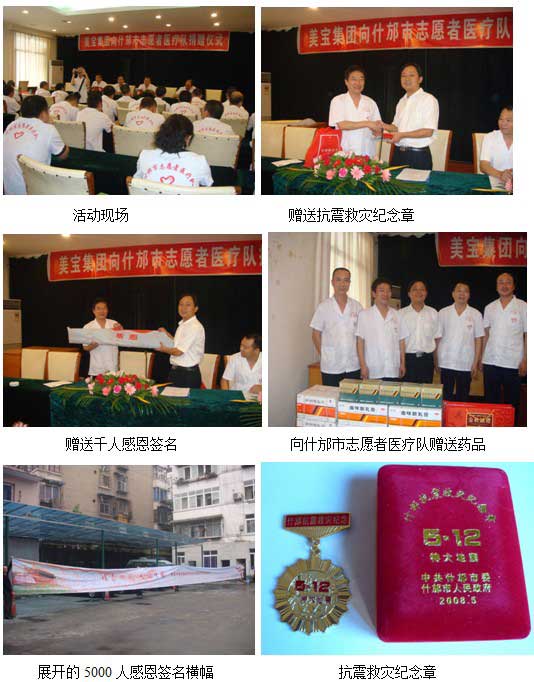 龔隊(duì)長(zhǎng)代表共青團(tuán)市委和志愿者醫(yī)療隊(duì)向美寶國(guó)際集團(tuán)贈(zèng)送了感恩錦旗、千人簽名的感恩橫幅、什邡市政府頒發(fā)的抗震救災(zāi)紀(jì)念章。美寶國(guó)際集團(tuán)四川分公司邱衛(wèi)東代表集團(tuán)向醫(yī)療隊(duì)贈(zèng)送了美寶藥品和節(jié)日慰問品。