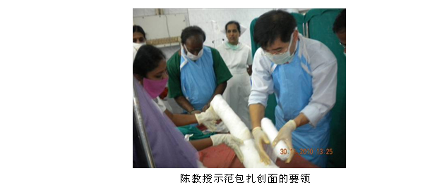 2、11月30日~12月1日,陳教授一行按計劃在KMC燒傷中心進行臨床試驗的培訓(xùn),對創(chuàng)面處理技術(shù)進行了示范和指導(dǎo)。按照研究設(shè)計,美寶濕潤燒傷膏印度III期臨床試驗是多中心隨機對照的試驗,因此陳教授先在試驗組示范了燒傷再生醫(yī)學(xué)與療法治療燒傷病例的標準操作程序(燒傷再生醫(yī)學(xué)之包扎療法),然后又給對照組示范了傳統(tǒng)方法治療燒傷創(chuàng)面的規(guī)范操作技術(shù)。經(jīng)過這2天的簡短的培訓(xùn),使參與研究的醫(yī)護人員更多地了解了整個臨床試驗的設(shè)計、實施步驟、創(chuàng)面處理要求、病例登記表的填寫等,為高質(zhì)量和保障安全地展開臨床試驗打下了一定的基礎(chǔ)。