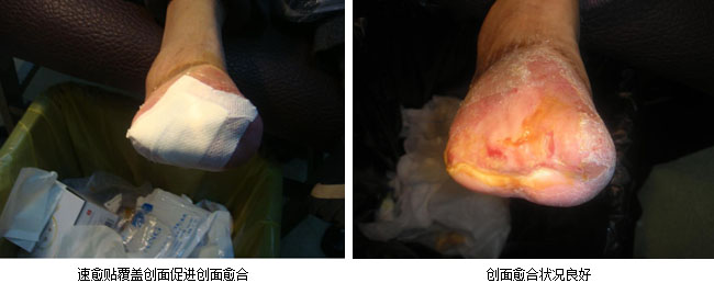 患者徐某,男,59歲,糖尿病20年。因糖尿病足壞疽在某省級醫(yī)院就診建議截肢,患者不愿意截肢轉院到哈爾濱醫(yī)科大學第一臨床醫(yī)院就診。入院診斷:1)Ⅰ型糖尿??;2)右下肢動脈閉塞性右糖尿病足壞疽半年。經(jīng)使用皮膚再生醫(yī)療技術及產(chǎn)品燒傷膏、速愈貼治療90天,創(chuàng)面基本愈合。