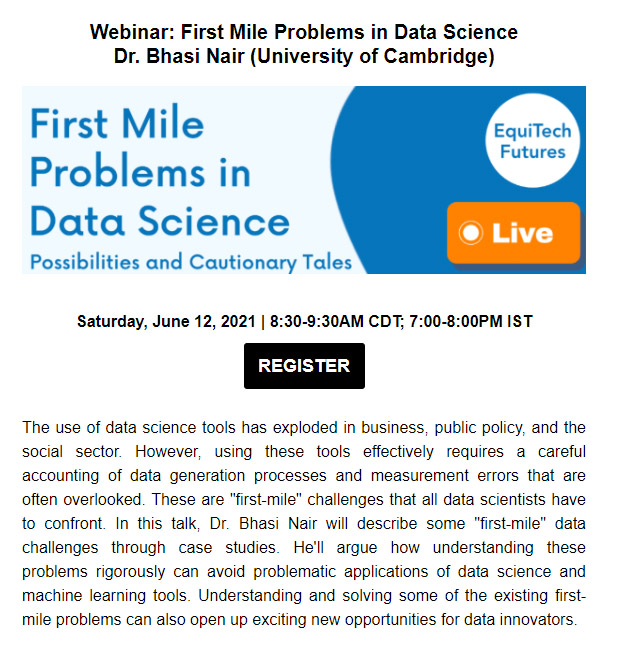 此前,芝加哥大學徐鵬智庫聯(lián)合牛津大學、劍橋大學、加州理工、阿斯本研究所等展開以“技術(shù)賦能未來”為核心的EquiTech Futures項目。為進一步利用科學技術(shù)解決復雜社會挑戰(zhàn),依托該項目,這些有抱負的創(chuàng)新組織徐鵬智庫及劍橋大學再度聯(lián)合召開了此次研討會。本次研討會上,劍橋大學Bhasi Nair博士通過案例研究對這些“第一英里”的數(shù)據(jù)挑戰(zhàn)進行了描述,并論證如何嚴謹?shù)乩斫膺@些問題才可以避免數(shù)據(jù)科學和機器學習工具的各種應(yīng)用問題。