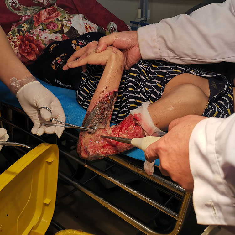 2月28日,應(yīng)陽江市陽東區(qū)人民醫(yī)院骨二科李主任和梁主任邀請,北京榮祥再生醫(yī)學(xué)研究所副所長、中國中西醫(yī)結(jié)合學(xué)會燒傷專業(yè)委員會常務(wù)委員、《中國燒傷創(chuàng)瘍雜志》副總編輯、應(yīng)用燒傷創(chuàng)瘍再生醫(yī)療技術(shù)治療糖尿病足領(lǐng)域?qū)<彝鹾樯魅螒?yīng)邀到該科室指導(dǎo)創(chuàng)面修復(fù)??平ㄔO(shè)及會診糖尿足潰瘍和壓瘡等慢性創(chuàng)面病人,并到手術(shù)室親自為三例慢性創(chuàng)面病人清創(chuàng)、換藥,指導(dǎo)創(chuàng)瘍再生醫(yī)療技術(shù)規(guī)范化應(yīng)用,得到醫(yī)護(hù)人員和患者的高度好評。