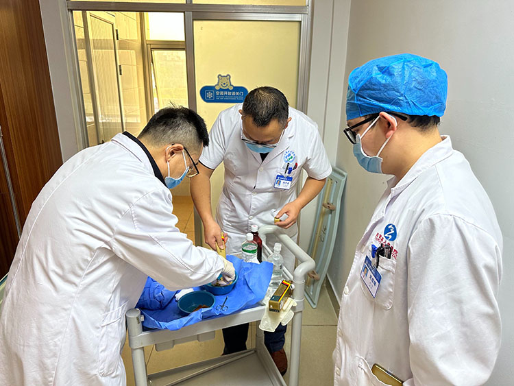 2023年2月27日,應(yīng)霍邱縣第二人民醫(yī)院燒傷科主任徐凡的邀請,中國中西醫(yī)結(jié)合學(xué)會燒傷專業(yè)委員會醫(yī)療部張強主任來院會診2例燒傷和1例血管閉塞性潰瘍病人,現(xiàn)場講解了再生醫(yī)療技術(shù)換藥技術(shù)要點并演示做油紗換藥。