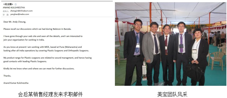 1月25日,大會(huì)順利召開,會(huì)場(chǎng)內(nèi)氣氛緊張而熱烈,而在會(huì)場(chǎng)之外我們又有許多新的收獲,在會(huì)場(chǎng)外我與張印經(jīng)理分頭行動(dòng),對(duì)場(chǎng)外所有的醫(yī)藥行業(yè)參展商進(jìn)行了交流,向他們介紹了再生技術(shù)的優(yōu)勢(shì)以及目前我們的技術(shù)在世界范圍內(nèi)的影響,以及目前在世界區(qū)域及印度當(dāng)?shù)氐氖袌?chǎng)前景及規(guī)劃,并向部分優(yōu)秀人員流露出美寶印度分公司對(duì)優(yōu)秀人才的需求,意想不到的是,多名參展銷售經(jīng)理及銷售人員在聽完介紹后,當(dāng)即便流露出加入美寶的意愿,并在會(huì)后發(fā)郵件過來表達(dá)自己對(duì)美寶的看法及渴望加入到團(tuán)隊(duì)中來,這些人員為今后美寶印度分公司的人力資源儲(chǔ)備給予了極大的補(bǔ)充。