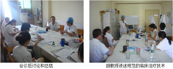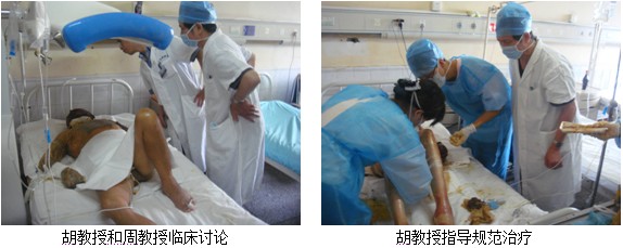 胡教授到達(dá)醫(yī)院后在周教授的陪同下直接到燒傷科病房會診正在接受治療的各位患者,胡教授對醫(yī)院規(guī)范使用再生醫(yī)療技術(shù)取得的臨床療效給予了高度評價(jià),應(yīng)周教授的要求胡教授還特別會診了一位燒傷面積60%的患者,該患者二度燒傷40%,三度燒傷20%,出現(xiàn)嚴(yán)重的肺部感染及嚴(yán)重的病發(fā)癥等情況,胡教授首先仔細(xì)地觀察病人的精神、意識狀況,同時向周教授詢問了患者的詳細(xì)情況、各項(xiàng)檢查指標(biāo)等。在了解患者情況后,胡教授親自指導(dǎo)大家應(yīng)用再生醫(yī)療技術(shù)對患者進(jìn)行了治療,同時還告訴大家治療的要點(diǎn)等。