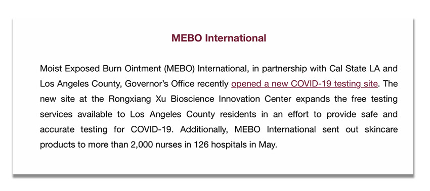 日前,美寶國(guó)際應(yīng)對(duì)新冠肺炎疫情的舉措作為典范被非營(yíng)利組織Concordia特別推薦,重點(diǎn)介紹了加州州立大學(xué)洛杉磯分校徐榮祥生物科學(xué)創(chuàng)新中心設(shè)立為新冠肺炎免費(fèi)檢測(cè)點(diǎn),為當(dāng)?shù)厣鐓^(qū)提供安全的COVID-19檢測(cè),幫助阻止病毒的傳播,在新冠肺炎流行中發(fā)揮的重要作用;以及美寶國(guó)際為126家醫(yī)院2000多名護(hù)士提供護(hù)膚品的愛(ài)心舉措。