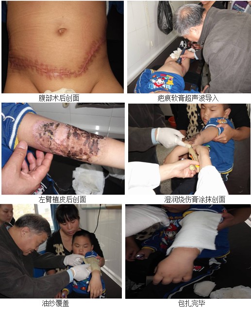 參會(huì)期間,金教授應(yīng)邀再次來到三峽大學(xué)仁和醫(yī)院手外整形科,為一位五歲左右的小男孩會(huì)診疤痕皮膚的治療?;颊咦蟊蹮齻?,從腹部取皮移植到手臂上,術(shù)后兩周腹部疤痕開始使用疤痕軟膏,已做導(dǎo)入治療一周,手臂還有黑痂?;颊吣赣H自述使用軟膏后疤痕變軟,金教授為小患者耐心做了疤痕軟膏導(dǎo)入治療,并為手臂換藥推薦了再生醫(yī)療技術(shù)濕性療法。主治醫(yī)師羅醫(yī)生和護(hù)理人員們也學(xué)習(xí)了濕潤(rùn)燒傷膏油紗條的制作和規(guī)范換藥方法。