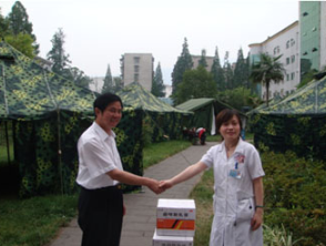 6月10日中國抗震救災創(chuàng)瘍專家醫(yī)療隊在會診病人的同時也再次代表醫(yī)療隊總指揮徐榮祥教授向醫(yī)院又捐贈了抗震救災急需藥品美寶創(chuàng)瘍貼一箱、曲咪新一箱、濕潤燒傷膏一箱,以及慰問金。一方面中國抗震救災創(chuàng)瘍專家醫(yī)療隊依然堅持在前線進行抗震救災傷員救治工作,另一方面力所能及地向災區(qū)醫(yī)院進行急需藥品、物質(zhì)支援。