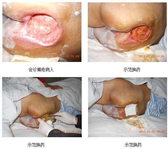 2012年3月7日,應黃岡市中心醫(yī)院燒傷整形美容科主任馮先才的邀請,中國燒傷創(chuàng)瘍研究所研究員、中國燒傷創(chuàng)瘍科技中心主任金黨軍老師到該科室會診一例褥瘡患者,該患者年齡72歲,創(chuàng)面直徑13cm,且創(chuàng)面周圍皮下均有空腔。金老師到病床前查看患者創(chuàng)面,親自給患者換藥,同時跟醫(yī)生講解燒傷膏的使用方法,以及油紗的制作和加壓包扎的規(guī)范操作。