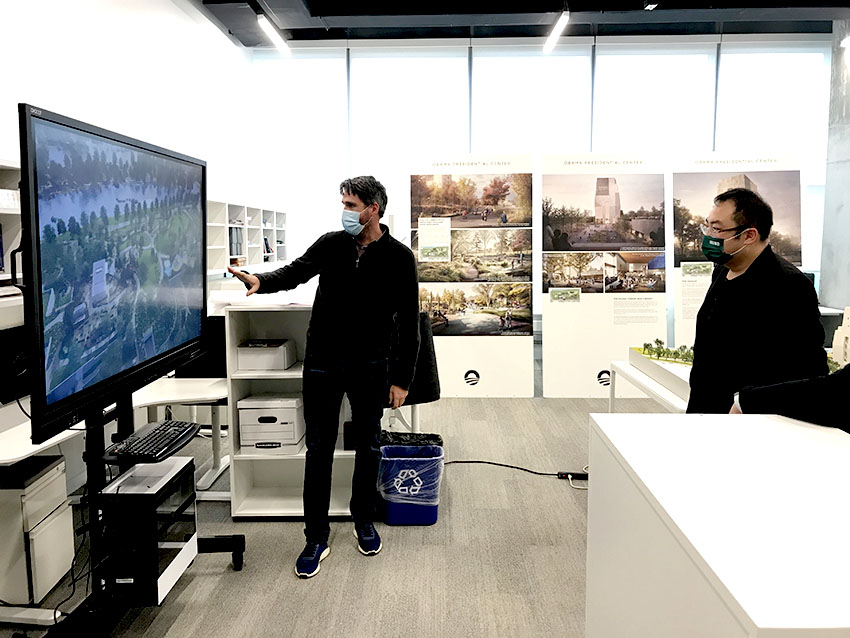 此外,奧巴馬總統(tǒng)中心項(xiàng)目的設(shè)計(jì)師和主管結(jié)合沙盤和三維動(dòng)畫向徐鵬介紹了項(xiàng)目的設(shè)計(jì)和軟硬件建設(shè)進(jìn)程。盡管受到疫情影響,奧巴馬總統(tǒng)中心仍將計(jì)劃于2025年竣工。