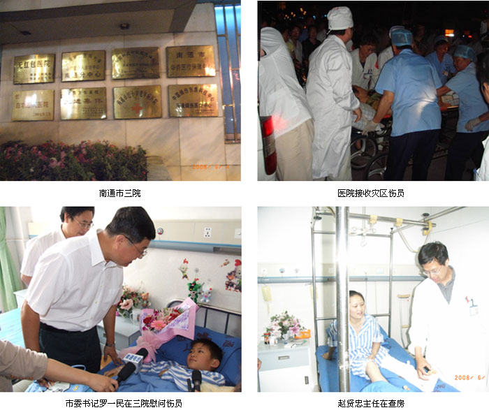 南通市第三人民醫(yī)院是一座集醫(yī)療、教學(xué)、科研為一體的三級(jí)甲等醫(yī)院,也是中國(guó)燒傷創(chuàng)瘍科技中心南通燒傷醫(yī)療中心,是全國(guó)燒傷創(chuàng)瘍醫(yī)療網(wǎng)的核心基地醫(yī)院。這次汶川地震傷員轉(zhuǎn)移治療中于2008年5月31日晚該院接收了10名四川傷員。災(zāi)區(qū)傷員到達(dá)當(dāng)晚,中國(guó)燒傷創(chuàng)瘍科技中心南通燒傷中心主任、中國(guó)抗震救災(zāi)創(chuàng)瘍專家醫(yī)療隊(duì)江蘇組長(zhǎng)趙賢忠主任受命對(duì)從災(zāi)區(qū)轉(zhuǎn)來(lái)南通三院的所有傷員進(jìn)行查房,并根據(jù)需要對(duì)所有相關(guān)傷員進(jìn)行會(huì)診治療,保證災(zāi)區(qū)傷員能得到先進(jìn)的再生療法治療,最大限度地減輕傷情,減少繼發(fā)殘廢。6月1日南通市委書(shū)記羅一民來(lái)到市三院 “愛(ài)心病房” 慰問(wèn)汶川災(zāi)區(qū)傷員者,他走到綿竹傷員病床前,關(guān)切地詢問(wèn)他的病情和護(hù)理情況,“你放心在這里養(yǎng)傷,南通人民就是你的親人?!崩钪蚊餮劾镩W著淚花: “醫(yī)護(hù)人員、志愿者都那么好,這里就像我的家!”
