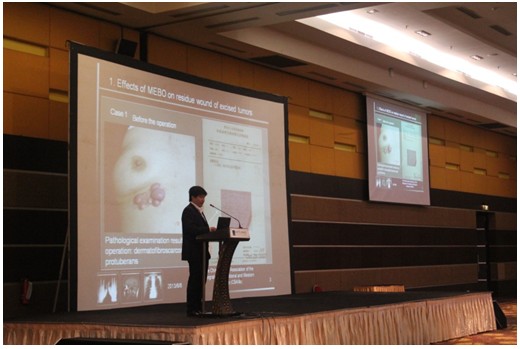 第三天會議繼續(xù)進行,來自中國中西醫(yī)結(jié)合學(xué)會燒傷專業(yè)委員會國際部主任舒葉被安排在全體會議中第一個發(fā)言。他演講的題目是再生醫(yī)療技術(shù)在癌癥創(chuàng)面的應(yīng)用,這一世界性難題用美寶再生科學(xué)的解決吸引了所有與會代表的眼球。舒葉主任先從再生醫(yī)療技術(shù)成功治療典型病例入手,深入分析三例皮膚癌患者在手術(shù)切除、放療等治療后,殘余創(chuàng)面應(yīng)用再生醫(yī)療技術(shù)成功抑制創(chuàng)面殘余癌細胞生長的病例。然后,重點展示對癌癥細胞在再生物質(zhì)環(huán)境下分別培養(yǎng)和共培養(yǎng)結(jié)果的基礎(chǔ)研究。單獨培養(yǎng)的結(jié)果表明再生物質(zhì)環(huán)境下,癌細胞會快速死亡;非再生物質(zhì)環(huán)境下,癌細胞會迅速增殖分化,正常細胞會迅速被癌細胞吞噬。癌細胞和正常細胞的共培養(yǎng)結(jié)果顯示,在再生物質(zhì)環(huán)境下,正常細胞會逐漸增殖、分化形成新的組織;而在對照組中,癌細胞會迅速擴張,正常細胞消失?;A(chǔ)研究的結(jié)果表明再生物質(zhì)具有抑制并殺死癌細胞,同時促進正常細胞生長的雙重功效。結(jié)合臨床真實的病例展示,再生醫(yī)療技術(shù)在癌癥方面的功效及研究吸引了全體與會人員的關(guān)注。會后,多名醫(yī)生詢問具體情況,并索要相關(guān)論文,要在當(dāng)?shù)亻_展使用。
