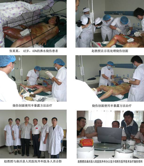 進(jìn)入盛夏的8月份,北京燒傷創(chuàng)瘍瘍研究所副所長趙瑞慶教授應(yīng)山東聊城中醫(yī)院、山東牟平人民醫(yī)院、山西襄汾縣中醫(yī)院、山西省曲沃縣人民醫(yī)院、山西省洪洞縣中醫(yī)院的邀請,先后搶救了兩例大面積燒傷患者,其中一例高壓電電擊燒傷患者,使用再生醫(yī)學(xué)技術(shù)取得了良好的臨床治療效果,同時,趙瑞慶教授還指導(dǎo)當(dāng)?shù)蒯t(yī)院使用再生醫(yī)學(xué)技術(shù)治療難愈合傷口也收到了滿意的療效。