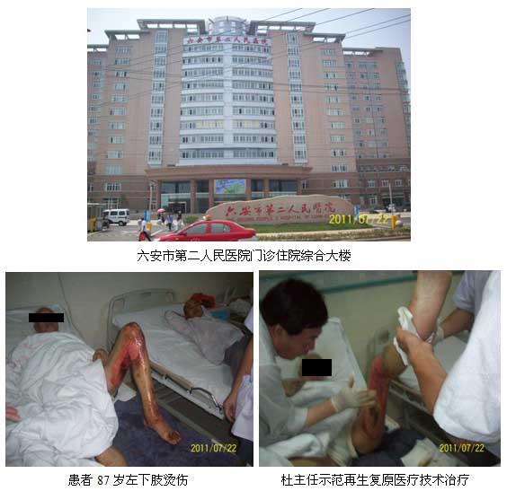 7月22日,杜主任走訪了六安市第二人民醫(yī)院外科、第一人民醫(yī)院燒傷整形科,與二院涂蒼慨主任深入交流再生復(fù)原醫(yī)療技術(shù)的發(fā)展和臨床實踐情況,下午為一名87歲老年燒傷患者示范再生復(fù)原醫(yī)療技術(shù)換藥。同時還走訪了一院燒傷整形科和趙遵江主任交流了再生復(fù)原醫(yī)療技術(shù)最近的研究成果和國內(nèi)外臨床實踐可喜的成果,達到了深入推廣再生復(fù)原醫(yī)療技術(shù)的目的。