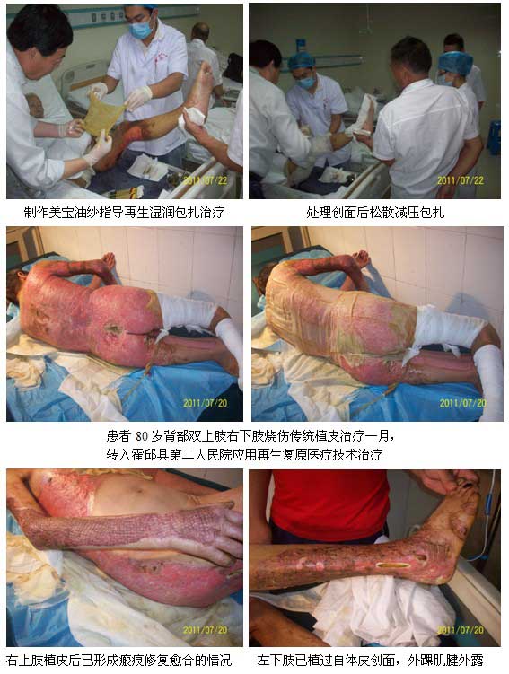 7月19日~20日,杜福勤主任應(yīng)霍邱第二人民醫(yī)院外科朱主任和徐凡主任的邀請,去該院會診一名80歲燒傷患者,該患者曾在省城某三甲醫(yī)院植皮治療后轉(zhuǎn)入霍邱二院應(yīng)用再生醫(yī)療技術(shù)治療,杜主任建議在應(yīng)用再生醫(yī)療技術(shù)治療燒傷創(chuàng)面的同時,加強對患者的營養(yǎng)支持,培養(yǎng)皮膚組織再生皮島,使之缺損皮膚組織最大化的再生愈合。7月21日,杜主任和二院婦產(chǎn)科的醫(yī)師們一同交流了醫(yī)用復(fù)合敷料美寶創(chuàng)瘍貼的療效及效果,介紹其功能、臨床效果、注意事項等。