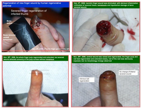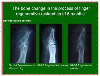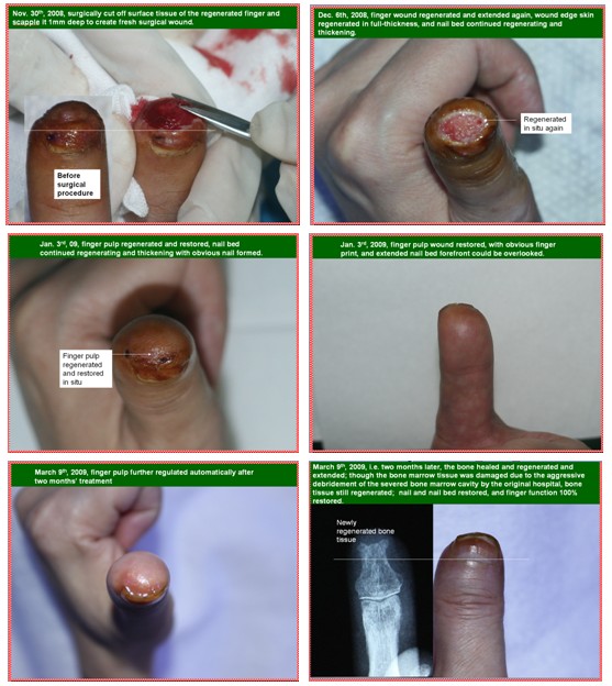 這是一個(gè)因外傷而斷指的患者6d~7d的創(chuàng)面。該指體離斷以后在醫(yī)院進(jìn)行了再植連接手術(shù),但沒(méi)有成活。而后來(lái)我們這里實(shí)施了原位再生復(fù)原斷指治療技術(shù),因?yàn)槭歉腥镜膭?chuàng)面,在22天時(shí),創(chuàng)面就提前封閉了,但指體沒(méi)有完全再生復(fù)原,缺少了一段。怎么辦?由于我們按照生命定律確認(rèn)所有器官里都有再生生命,重新再生的手指指體里仍然繼承了人體再生潛能的結(jié)構(gòu),我們相信這個(gè)斷指還能再生,所以我們重新截掉部分新再生的指體,形成新鮮的創(chuàng)面,再重新原位培養(yǎng)指體斷面,最后指體原位再生復(fù)原了。人體是由上皮組織、結(jié)締組織、肌肉組織、神經(jīng)組織這四大組織組成,現(xiàn)在含有這四大組織的斷指再生修復(fù)了,堅(jiān)信人體組織完全可實(shí)現(xiàn)原位再生復(fù)原。以上病例驗(yàn)證了人體又表達(dá)出了新的再生生命定律。
