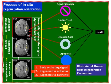 人在30歲以前,各器官、組織中的細(xì)胞維持在平衡狀態(tài),器官功能強(qiáng)壯,細(xì)胞功能旺盛,人體“基本生命”強(qiáng)盛。過(guò)了30歲,則人體器官和組織中的細(xì)胞開始出現(xiàn)相對(duì)平衡,細(xì)胞開始衰老,出現(xiàn)了正常生長(zhǎng)的細(xì)胞、少量衰老的細(xì)胞與死亡細(xì)胞之間的相對(duì)平衡維持,器官功能正常,細(xì)胞功能相對(duì)旺盛,人體“基本生命”相對(duì)旺盛。人超過(guò)了40歲,衰老的細(xì)胞開始增多,衰老狀態(tài)細(xì)胞與生長(zhǎng)狀態(tài)細(xì)胞幾乎處于相同的比例狀態(tài),此時(shí)尚且還能夠維持這種生長(zhǎng)與衰老細(xì)胞及死亡細(xì)胞在數(shù)量上的平衡狀態(tài),但器官功能已經(jīng)開始下降,細(xì)胞功能也開始出現(xiàn)減退,人體“基本生命”開始出現(xiàn)衰弱表現(xiàn)。當(dāng)人超過(guò)了50歲,正常生長(zhǎng)細(xì)胞越來(lái)越少,衰老細(xì)胞越來(lái)越多,人體衰老細(xì)胞的數(shù)目已經(jīng)超過(guò)了正常生長(zhǎng)的細(xì)胞數(shù)目,此時(shí)衰老的細(xì)胞占了多數(shù),平衡狀態(tài)就被打破,并隨著年齡增長(zhǎng),人體細(xì)胞開始出現(xiàn)纖維化、疾病、異變及凋亡等現(xiàn)象,器官開始出現(xiàn)退行性改變,器官功能進(jìn)一步下降,細(xì)胞功能進(jìn)一步低下,人體“基本生命”也更加衰弱,當(dāng)這些細(xì)胞達(dá)到一定數(shù)量時(shí),會(huì)導(dǎo)致器官功能喪失,進(jìn)而人體死亡狀態(tài),人體“基本生命”終止。但如果啟動(dòng)人體潛能生命體的功能,人體一旦進(jìn)入再生復(fù)原后,上述“基本生命”的規(guī)律將發(fā)生改變,再生復(fù)原可以使人體“基本生命”得到保障和加強(qiáng),人體“基本生命”可以重新保持旺盛的生命活力。