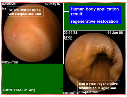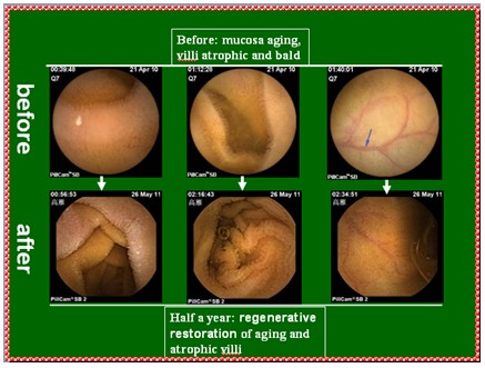 某會(huì)員,42歲,胃腸道衰老非常嚴(yán)重。養(yǎng)生前膠囊胃鏡表現(xiàn):小腸粘膜和粘膜下層明顯萎縮,變薄,粘膜下血管網(wǎng)及血管袢清晰可見,絨毛稀疏、增寬而短、斷裂、退化、部分區(qū)域絨毛脫落甚至脫失,隱窩深度變淺。整個(gè)胃腸黏膜系統(tǒng)呈現(xiàn)衰老狀態(tài)。養(yǎng)生一年后膠囊胃鏡表現(xiàn):小腸粘膜和粘膜下層明顯增厚,看不到粘膜下血管網(wǎng)及血管袢,絨毛濃密、長(zhǎng)度增加,直徑增粗,沒(méi)有明顯斷裂、脫落、脫失的絨毛粘膜,隱窩變深。整個(gè)胃腸黏膜系統(tǒng)完全呈現(xiàn)為年輕健康的狀態(tài)。這個(gè)結(jié)果是當(dāng)前生命科學(xué)前沿所不能達(dá)到的。器官移植雖然可以,但移植本身是有缺陷的。