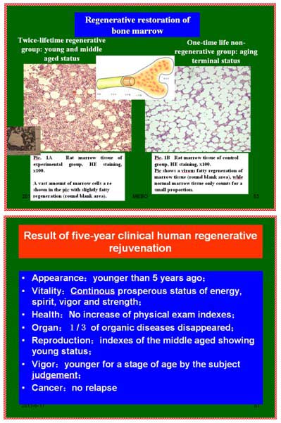 試驗(yàn)證明,大白鼠實(shí)現(xiàn)了2倍年齡不衰老,人體就能實(shí)現(xiàn)2倍年齡不衰老。我們對(duì)每個(gè)器官都進(jìn)行驗(yàn)證。試驗(yàn)結(jié)果:用300天雄性大白鼠,相當(dāng)于人類60歲,一組加再生物質(zhì)喂養(yǎng),一組不加再生物質(zhì)喂養(yǎng)。沒(méi)有加再生物質(zhì)喂養(yǎng)的老鼠,在一倍壽命(平均480天)時(shí)就衰老死亡了,器官組織學(xué)檢查確認(rèn)各器官都衰老于中年。而加入再生物質(zhì)喂養(yǎng)的老鼠活到兩倍壽命時(shí)還都活著,通過(guò)器官組織學(xué)檢查,各個(gè)器官都處于年輕狀態(tài)。目前,冠心病、腎臟,肺纖維化等疾病通過(guò)再生復(fù)原醫(yī)療技術(shù),按照人體再生生命定律,器官衰老難題都已經(jīng)解決了。