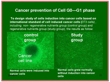 3T3細(xì)胞是美國(guó)NIH的測(cè)試致癌物質(zhì)的細(xì)胞,國(guó)際上就用這個(gè)細(xì)胞來(lái)測(cè)定一些物質(zhì)是否致癌?,F(xiàn)在我們用一個(gè)很簡(jiǎn)單的實(shí)驗(yàn),就是用已確認(rèn)的致癌物質(zhì)誘導(dǎo)正常細(xì)胞變成癌細(xì)胞實(shí)驗(yàn)?zāi)P停由显偕镔|(zhì)后,3T3細(xì)胞誘導(dǎo)都不變成癌細(xì)胞。因?yàn)閺腉o期細(xì)胞內(nèi)各細(xì)胞器逐步增加,增加至一定水平后就會(huì)進(jìn)入G1期,G1期時(shí)細(xì)胞核會(huì)分裂產(chǎn)生新細(xì)胞,我們卻能夠阻止細(xì)胞進(jìn)入G1期(這是目前世界研究的空白),我們可以讓細(xì)胞在即將進(jìn)入G1期(細(xì)胞基因變化完成)時(shí)逆轉(zhuǎn),回到G0期,整個(gè)過(guò)程全部在人為的控制下(這個(gè)實(shí)驗(yàn)早在2001年便已經(jīng)完成)。這個(gè)控制依靠的是再生物質(zhì),用再生物質(zhì)量的關(guān)系控制這個(gè)途徑,不是用改變基因的物質(zhì)控制的。再生物質(zhì)量多和量少是不一樣的,量少則達(dá)不到啟動(dòng)再生程序要求。再生物質(zhì)的量決定了細(xì)胞內(nèi)細(xì)胞器的量,使得細(xì)胞器的代謝旺盛,所以我們的結(jié)論是用細(xì)胞代謝來(lái)控制生命,用控制細(xì)胞的代謝實(shí)現(xiàn)了人體的再生。而不是用改變細(xì)胞屬性的方法來(lái)控制生命,我們一直的觀念就是“任何改變生命屬性的研究都是反人類的”。這是我們對(duì)癌癥的研究情況,癌癥已變得很簡(jiǎn)單,而其他人把研究癌的方向集中到細(xì)胞核里的遺傳物質(zhì)去了,研究方向搞錯(cuò)了。
