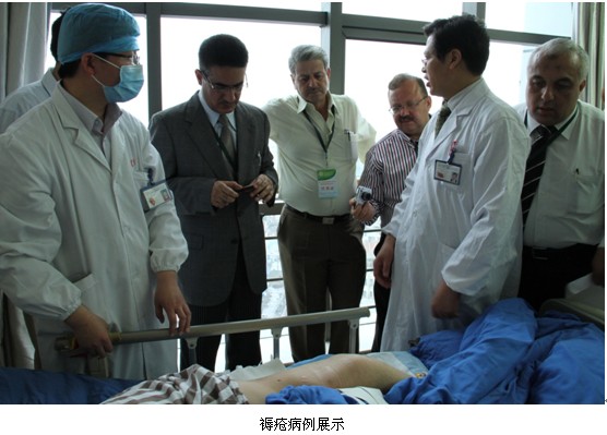 隨著院方引導(dǎo)員的指引,專家們來到了此次參觀的重點部分——燒創(chuàng)傷科室,在此接待的是燒傷科的趙主任。趙主任首先介紹了美寶再生產(chǎn)品在醫(yī)院的使用情況,隨后將專家們帶進住院病房,分別通過一個燒傷病例和一個褥瘡病例展示了美寶產(chǎn)品在治療燒傷創(chuàng)瘍領(lǐng)域的獨特功效。第一個病例是一個深二度燒傷病人,趙主任展示了經(jīng)過一段時間美寶燒傷膏的使用病人的恢復(fù)情況,并現(xiàn)場對國際專家并行了美寶燒傷膏換藥的操作示范,使專家團對美寶產(chǎn)品有了更加全面和更加深入的認識。