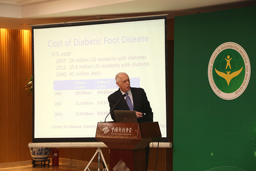 來(lái)自各醫(yī)學(xué)專家教授圍繞再生醫(yī)學(xué)與創(chuàng)面修復(fù)分別發(fā)表了重要學(xué)術(shù)演講。哈佛醫(yī)學(xué)院外科副教授、BIDMC足病科主任約翰·吉里尼博士在大會(huì)上向現(xiàn)場(chǎng)來(lái)賓陳述了糖尿病潰瘍發(fā)病過(guò)程及如何治療,重點(diǎn)剖析了足部潰瘍的原因并從病理學(xué)和微生物學(xué)檢查等方面講解了應(yīng)對(duì)及預(yù)防的措施和治療效果,從而降低截肢率。