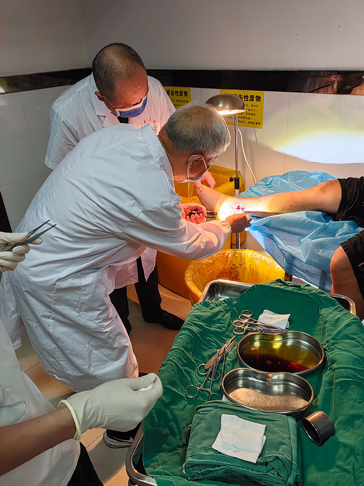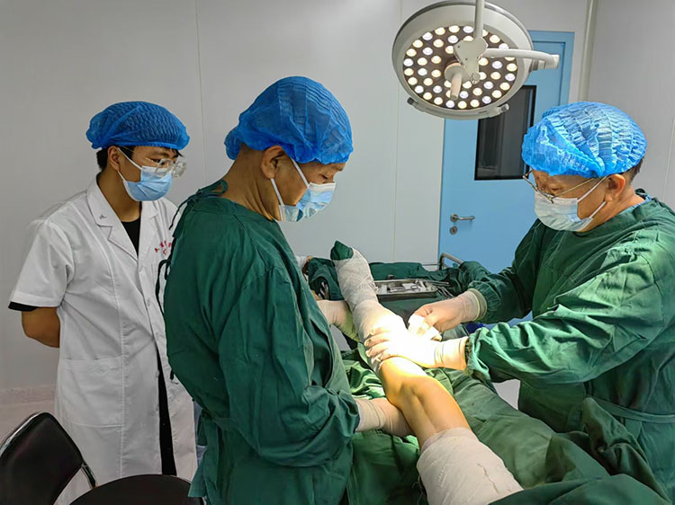 2024年8月12日,應(yīng)高平民生燒傷??漆t(yī)院邀請,《中國燒傷創(chuàng)瘍雜志》常務(wù)編委、燒傷創(chuàng)瘍再生醫(yī)療技術(shù)臨床專家趙瑞慶,在該院會診了二例患者,一例因摩托車排氣管燙傷左下肢三度燒傷,另外一例為左下肢踝關(guān)節(jié)內(nèi)側(cè)慢性創(chuàng)面13年未愈,針對關(guān)節(jié)功能部位的特殊性采取措施,術(shù)中順利,出血不多,病人安返病房。趙教授就有關(guān)術(shù)后管理注意事項做了詳細(xì)布置。得到醫(yī)護人員及家屬的一致好評。