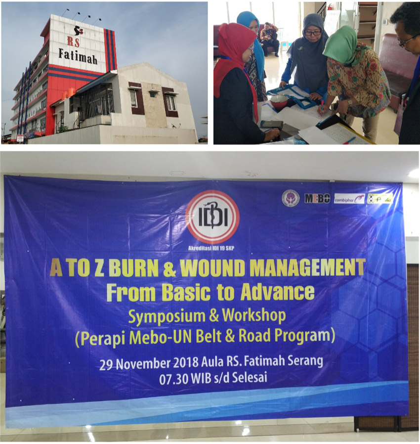 早上7點30,第三屆“一帶一路”倡議全球再生醫(yī)學(xué)大型培訓(xùn)班在西朗市第二級別醫(yī)院RS Fatimah如期舉行。首先,美寶國際印尼戰(zhàn)略合作伙伴Combiphar集團的支持人代表公司向美寶國際籌辦此次活動及到場的各位專家表示歡迎和感謝。隨后根據(jù)議程安排,由美寶國際印尼市場負責人向到場的講師和與會專家進行了詳細的培訓(xùn)班及活動主旨介紹,簡要的介紹了再生醫(yī)學(xué)在世界范圍內(nèi)的應(yīng)用情況。隨后,印尼整形協(xié)會副會長Dr. Irena Sakura Rini, 美容整形專家Dr M adib, 耳鼻喉科專家Dr Hendrarto, 本院副院長及創(chuàng)瘍專家Dr Budi suhendar(圖一左至右)與本醫(yī)院的燒傷創(chuàng)瘍科全體人員合影。