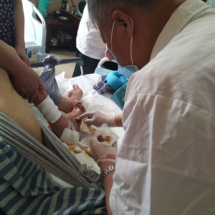 5月21日下午,北京榮祥再生醫(yī)學(xué)研究所副所長(zhǎng)、中國(guó)中西醫(yī)結(jié)合學(xué)會(huì)燒傷專業(yè)委員會(huì)常務(wù)委員、《燒傷創(chuàng)瘍雜志》副總編輯、應(yīng)用燒傷創(chuàng)瘍?cè)偕t(yī)療技術(shù)治療糖尿病足領(lǐng)域?qū)<?、研究員王洪生教授應(yīng)邀前往廣東省四會(huì)市萬(wàn)隆醫(yī)院會(huì)診6例病人,其中一例燒傷病人達(dá)40%、三度燒傷達(dá)10%的重度燒傷,王教授指導(dǎo)并帶領(lǐng)全科主任醫(yī)生護(hù)理共6人在病房換藥,并在此過(guò)程中糾正一些不規(guī)范的換藥事項(xiàng),效果明顯。