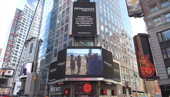 紐約時(shí)代廣場(chǎng)看板美通社新聞也報(bào)道了美寶湖畔獨(dú)立日慶祝煙火晚會(huì),圖為徐榮祥基金會(huì)主席李俐在晚會(huì)現(xiàn)場(chǎng)接受媒體采訪。
