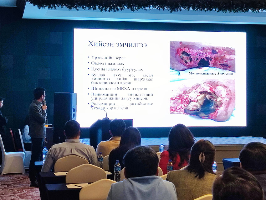 此次培訓(xùn),蒙古古爾醫(yī)院創(chuàng)傷外科主任Dr. A. Altan-Od以《蒙古古爾醫(yī)院的再生醫(yī)療技術(shù)臨床應(yīng)用成果》為題進(jìn)行了主旨講座。Dr. A. Altan-Od在演講中展示了近年來治療多種復(fù)雜難愈創(chuàng)面的經(jīng)驗(yàn),特別是糖尿病足潰瘍合并骨外露等的治療,給在場(chǎng)的創(chuàng)面專家留下了深刻的印象。