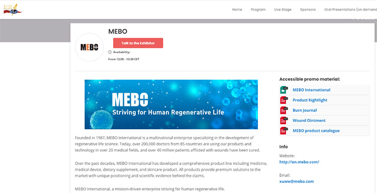 自2010年以來,美寶國際已經(jīng)連續(xù)參加了6屆ISBI大會,是ISBI最重要的合作伙伴之一。繼2016年和2018年連續(xù)2屆成為ISBI大會最高級別贊助商后,美寶國際今年再次成為ISBI大會的最大贊助商之一。此次大會上,美寶國際精心設(shè)計了電子展臺,力求從多方面向參會者展示企業(yè)風(fēng)采。展臺上不僅展示了濕潤燒傷膏、疤痕軟膏、創(chuàng)瘍貼等已在全球應(yīng)用數(shù)十年的核心產(chǎn)品,還同時與全球?qū)<曳窒砹藵駶櫉齻嘀委煙齻淖钚屡R床研究進展。