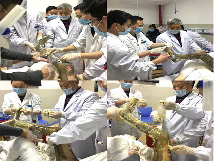 李主任陪同金教授與劉群峰醫(yī)生,張耀武醫(yī)生,鄭孟杰醫(yī)生,王帥醫(yī)生及于海洋醫(yī)生,共同會診了五位燒燙傷患者,一位雙足凍傷患者,一位疑似下肢栓塞并感染患者和一位丹毒患者。各位醫(yī)師在進(jìn)行再生醫(yī)療技術(shù)規(guī)范換藥過程中,積極同金教授探討技術(shù)要點,如:怎樣探查壞死組織的深淺;創(chuàng)面壞死組織削除深淺及技巧等。當(dāng)大家會診到一位70%大面積燒傷高齡患者時,在金教授和李主任的帶領(lǐng)下,科室全體總動員,大家密切配合,規(guī)范操作,歷時近兩個小時完成創(chuàng)面治療!