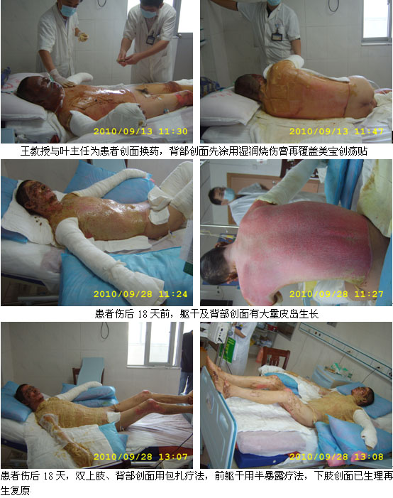 為確保對該患者的成功救治,王教授又于2010年9月28日再次到惠陽區(qū)第一人民醫(yī)院指導(dǎo)對該患者的救治工作,并深入病房,親自為患者清創(chuàng)換藥,指導(dǎo)主管大夫如何規(guī)范處理患者液化期III度創(chuàng)面的壞死組織和清創(chuàng)方法。