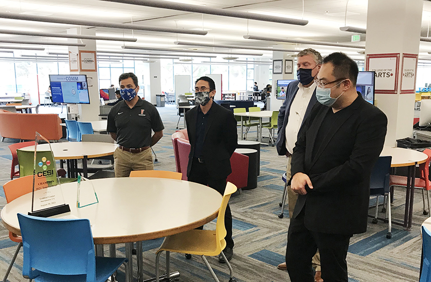 當(dāng)?shù)貢r(shí)間10月8日,美寶集團(tuán)董事局主席徐鵬攜洛杉磯周刊(LA Weekly)CEO Calle應(yīng)邀參觀考察了加州州立大學(xué)富勒頓分校電競(jìng)項(xiàng)目及電競(jìng)團(tuán)隊(duì)。加州州立大學(xué)富勒頓分校校長(zhǎng)Fram Virje(在線(xiàn))、副校長(zhǎng) Greg Saks在校園現(xiàn)場(chǎng)熱情接待了徐鵬一行。校長(zhǎng)Fram Virje特別介紹了該校,表示富勒頓分校是整個(gè)加州學(xué)生數(shù)量最多的公立大學(xué),并對(duì)徐鵬對(duì)學(xué)校的支持及學(xué)生的指導(dǎo)表示了感謝。Saks副校長(zhǎng)特意帶領(lǐng)徐鵬一行參觀了富勒頓分校圖書(shū)館電競(jìng)中心,該校電競(jìng)隊(duì)伍今年斬獲了薩科拉門(mén)托國(guó)王隊(duì)主場(chǎng)體育館舉行的電競(jìng)比賽冠軍。