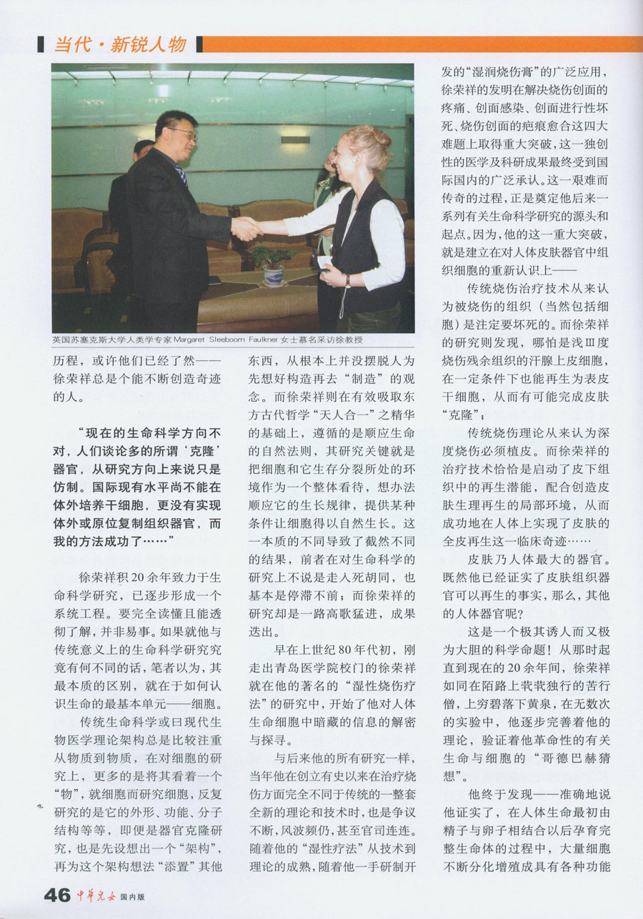 與后來他的所有研究一樣,當(dāng)年他在創(chuàng)立有史以來在治療燒傷方面完全不同于傳統(tǒng)的一整套全新的理論和技術(shù)時,也是爭議不斷,風(fēng)波頻仍,甚至官司連連。隨著他的“濕性療法”從技術(shù)到理論的成熟,隨著他一手研制開發(fā)的“濕潤燒傷膏”的廣泛應(yīng)用,徐榮祥的發(fā)明在解決燒傷創(chuàng)面的疼痛、創(chuàng)面感染、創(chuàng)面進(jìn)行性壞死、燒傷創(chuàng)面的疤痕愈合這四大難題上取得重大突破,這一獨(dú)創(chuàng)性的醫(yī)學(xué)及科研成果最終受到國際國內(nèi)的廣泛承認(rèn)。這一艱難而傳奇的過程,正是奠定他后來一系列有關(guān)生命科學(xué)研究的源頭和起點(diǎn)。因?yàn)?,他的這一重大突破,就是建立在對人體皮膚器官中組織細(xì)胞的重新認(rèn)識上——