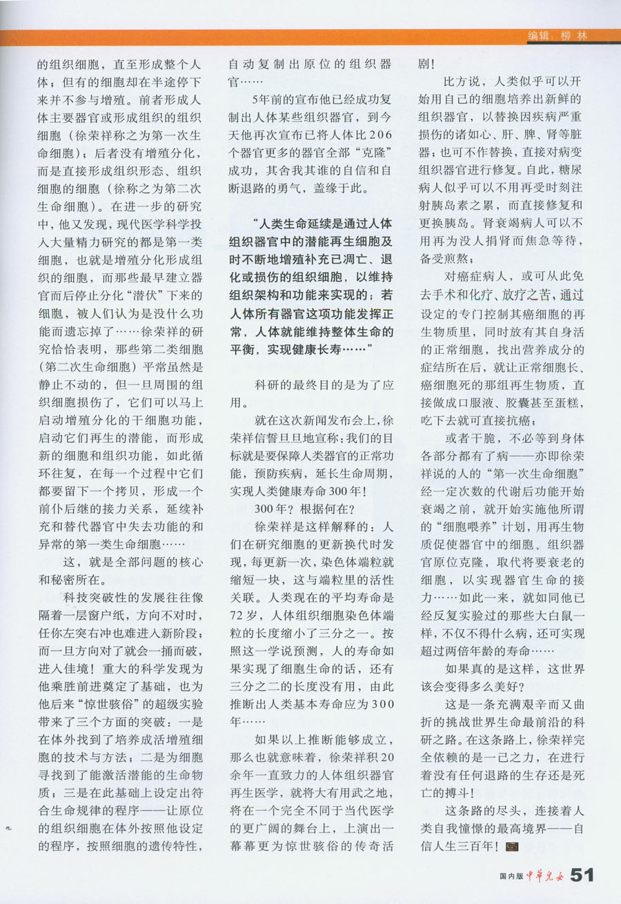 2002年8月1 6日,備受爭議的醫(yī)學(xué)科學(xué)工作者徐榮祥教授通過媒體宣布,他和他的研究團(tuán)隊(duì)經(jīng)數(shù)年努力.在人體原位和體外成功復(fù)制出了組織器官!同時宣布,將用5年時間“克隆”出人體所有組織器官.同時破解癌癥之謎!這一爆炸性的新聞,震驚了醫(yī)學(xué)科學(xué)界,一時間質(zhì)疑聲四起。同年的《中華兒女》第1 0期上,就以《驚世駭俗徐榮祥》為題,詳細(xì)報(bào)道了他別辟蹊徑的生命科學(xué)研究之路。