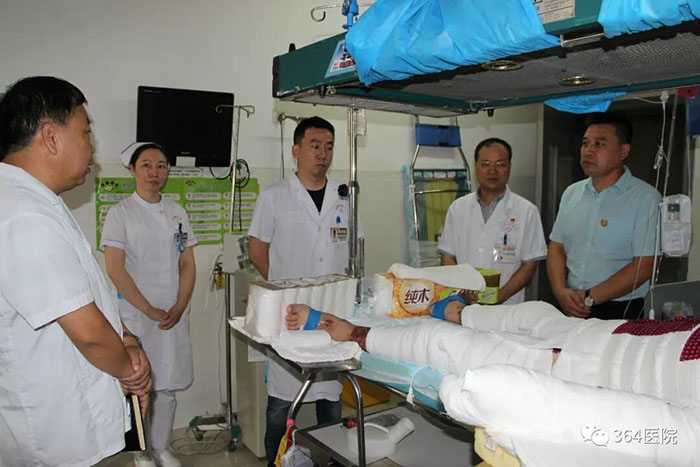 9月5日上午,中國(guó)紅十字基金會(huì)徐榮祥再生生命公益基金志愿者黃彥勇一行,在364醫(yī)院黨委書記、院長(zhǎng)李廣衡和副院長(zhǎng)張鋒、劉永良的陪同下,來到航空工業(yè)襄陽醫(yī)院(364醫(yī)院)燒傷科重病監(jiān)護(hù)室,看望慰問特重度燒傷患者任海鵬及其家屬龍榮榮。