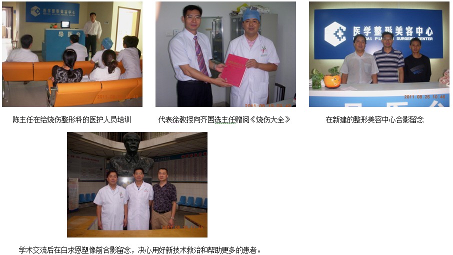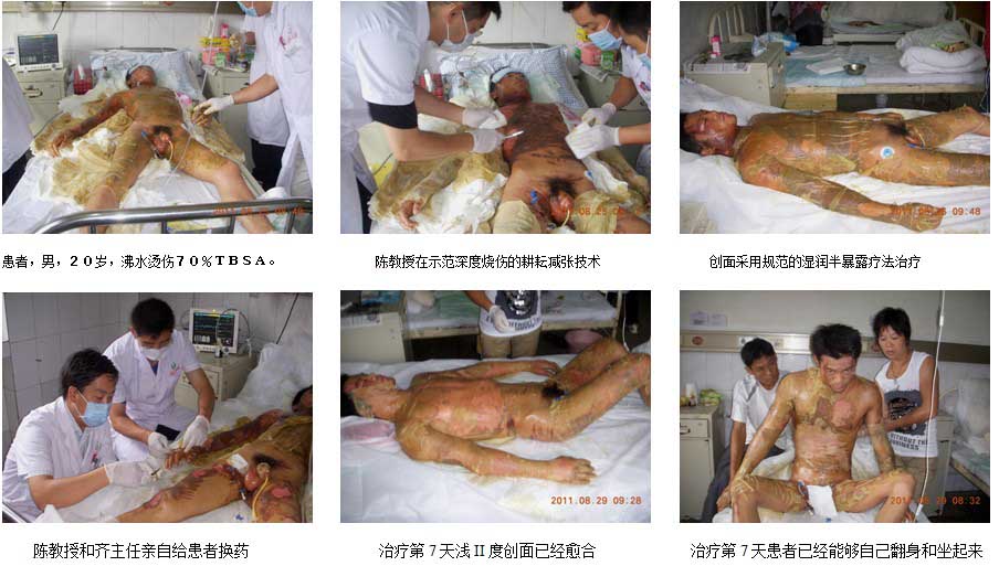 今年8月,應(yīng)醫(yī)院燒傷整形科齊國選主任的邀請,中國燒傷創(chuàng)瘍科技中心臨床部主任、北京中西醫(yī)結(jié)合學(xué)會燒傷專業(yè)委員會副主任委員、國際燒傷外科學(xué)會會員陳永翀主任在中國中西醫(yī)結(jié)合學(xué)會燒傷專業(yè)委員會安徽辦事處張朝軍主任和吳崇偉老師的陪同下,先后2次到該院進(jìn)行學(xué)術(shù)交流、技術(shù)培訓(xùn)和指導(dǎo)搶救大面積特重度燒傷和創(chuàng)瘍患者。通過這次學(xué)術(shù)交流和討論,大家對再生醫(yī)學(xué)有了更深入的了解和掌握,對再生醫(yī)學(xué)的臨床療效有了更深刻的認(rèn)識,在應(yīng)用再生醫(yī)學(xué)救治大面積特重度燒傷方面取得了長足的進(jìn)步,齊國選主任和他帶領(lǐng)的團(tuán)隊在再生醫(yī)學(xué)新技術(shù)的臨床應(yīng)用上已經(jīng)達(dá)到了安徽省內(nèi)領(lǐng)先水平。 現(xiàn)將這次學(xué)術(shù)交流和臨床救治患者的情況介紹如下: