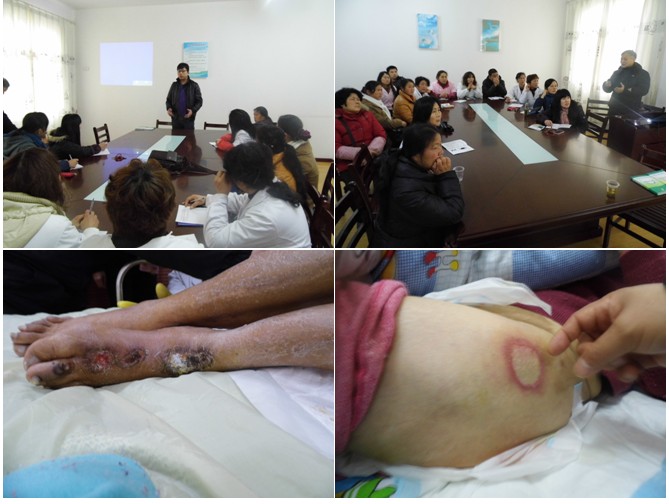 在三樓的會議室,郭院長召集了全體護(hù)理人員進(jìn)行培訓(xùn),并要求大家認(rèn)真聽講,珍惜這次難得的機(jī)遇,黃岡區(qū)域人員高偉介紹了金黨軍主任的學(xué)術(shù)背景以及再生醫(yī)療技術(shù)在實(shí)踐中的重大意義;金主任為學(xué)員們準(zhǔn)備了通俗易懂便于實(shí)際操作的課件,有針對性的結(jié)合重點(diǎn)病例,講解了再生醫(yī)療技術(shù)在壓瘡、糖尿病足等慢性難治性皮膚潰瘍治療方面的原則和換藥方法,回答了學(xué)員們的各種提問。最后,在郭院長的陪同下,金主任到各個樓層為幾位患病老人會診,現(xiàn)場講解治療換藥時需要注意的事項(xiàng)和方法。